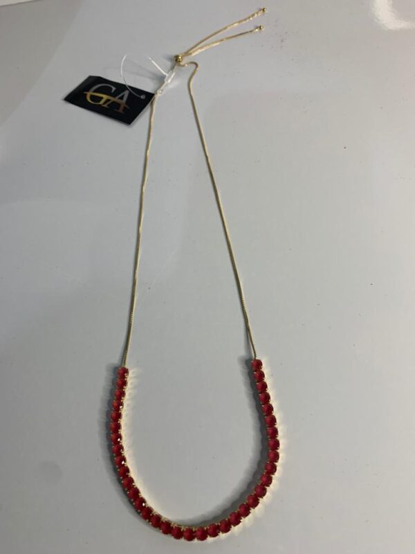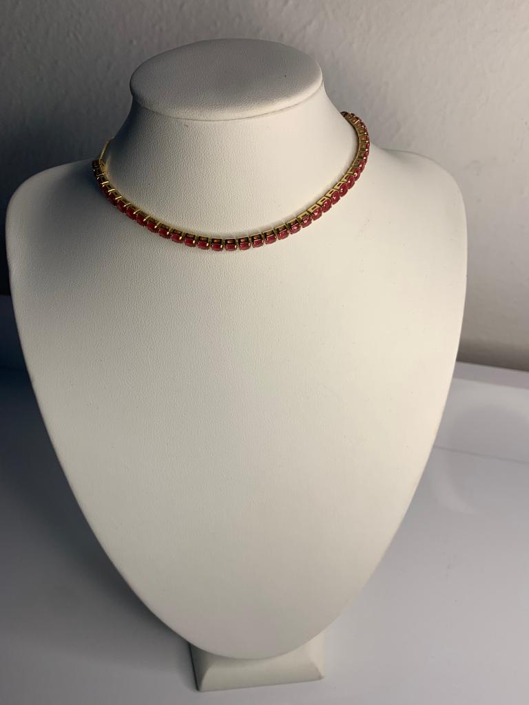Colar Riviera com pedrinhas vermelhas, para ser usado coladinho no pescoço.